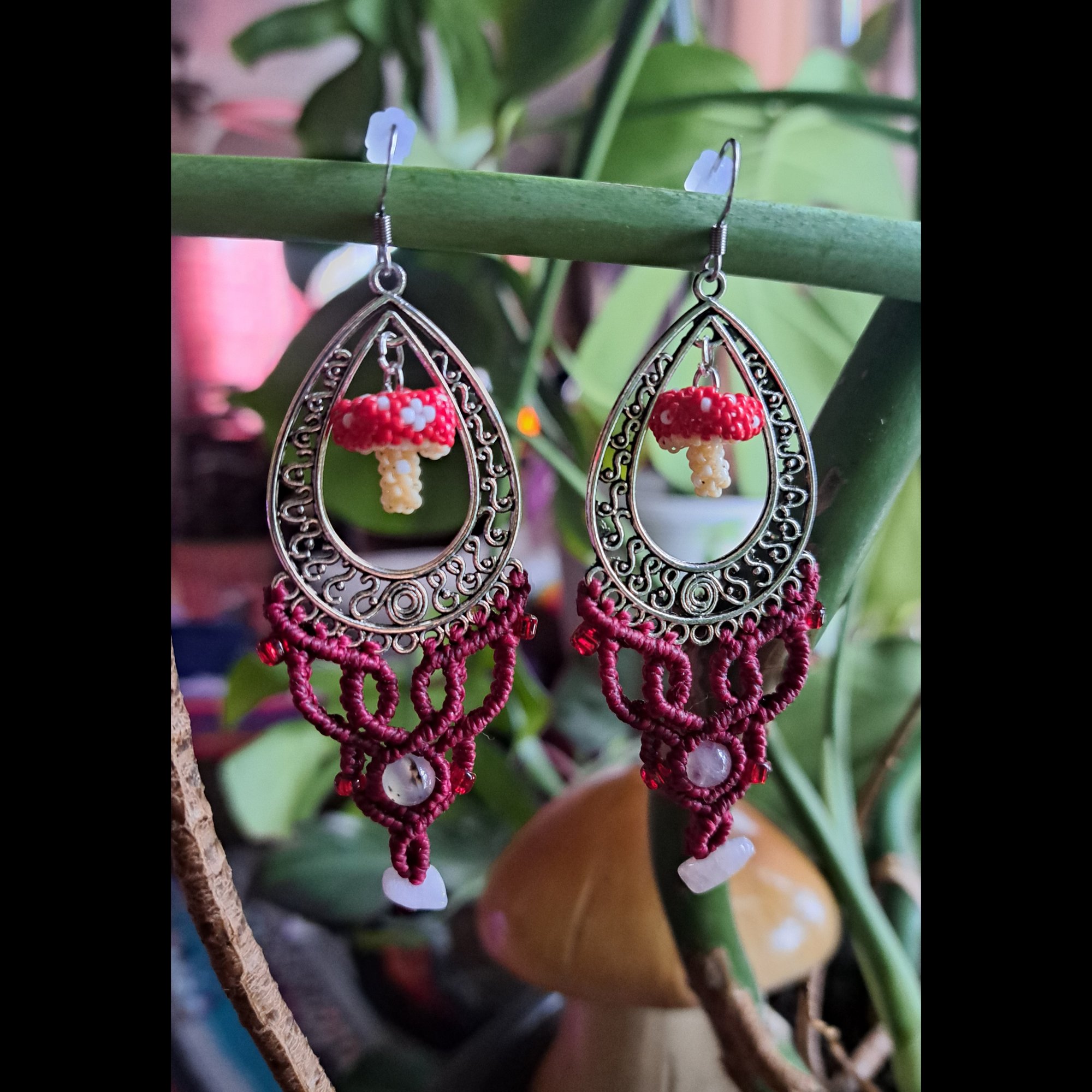 These earrings were created in collaboration with Charleigh Graham. She has handcrafted the beaded mushroom and I have created the macramé portion.